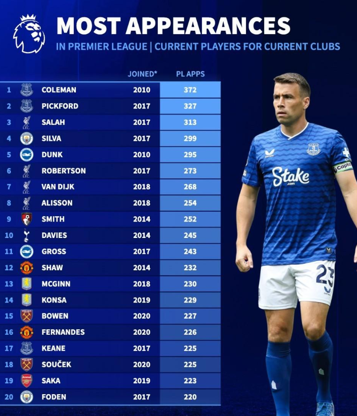 近日,德转统计了英超球员代表现俱乐部联赛出场次数榜,埃弗顿老将科尔曼自2010年升入一线队以来已出场372次高居榜首,队友皮克福德以327次位列第二。利物浦传奇萨拉赫以313次排名第三,曼城队长B席以299次排名第四位。