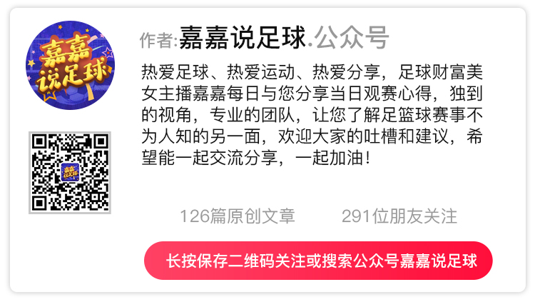 想获取更多精彩赛事,微信搜索公众号关注【嘉嘉说足球】