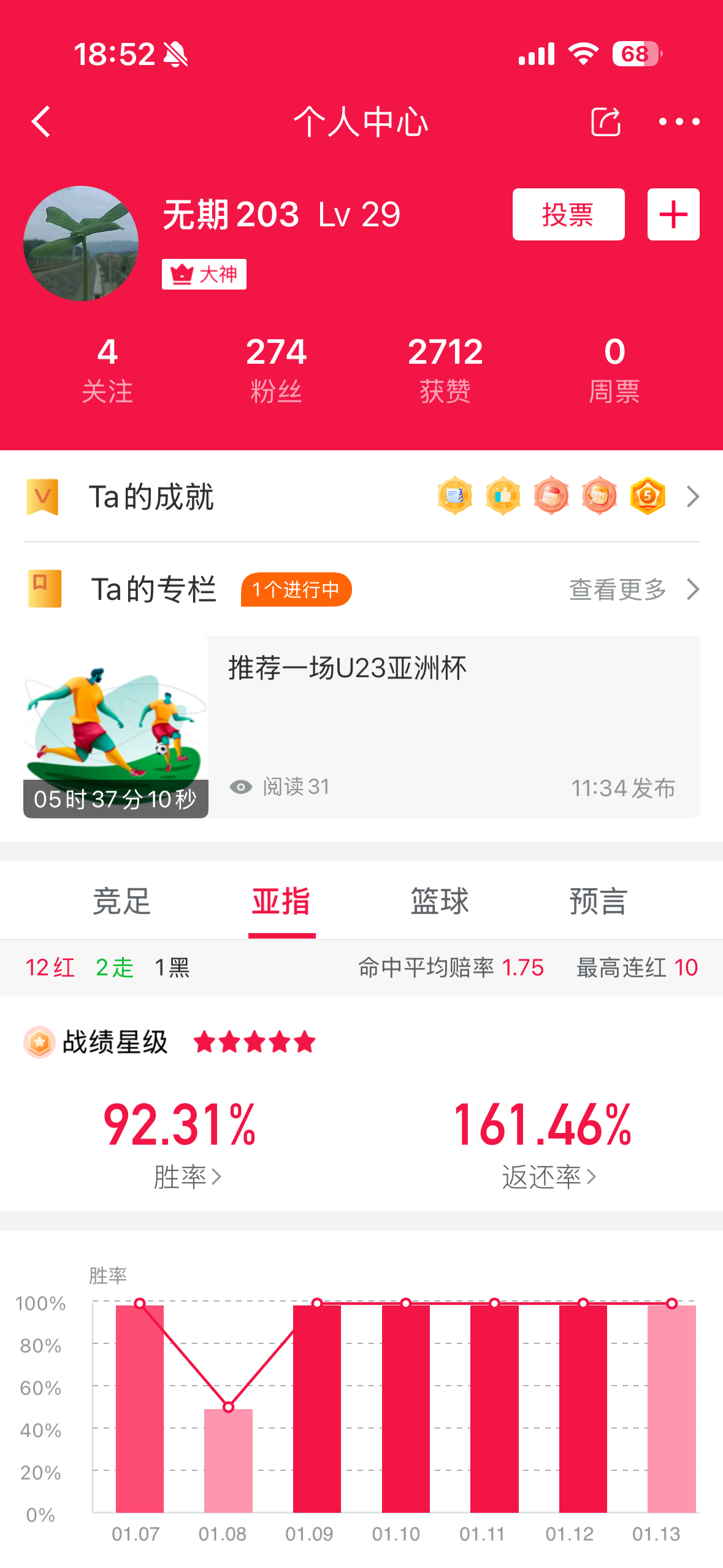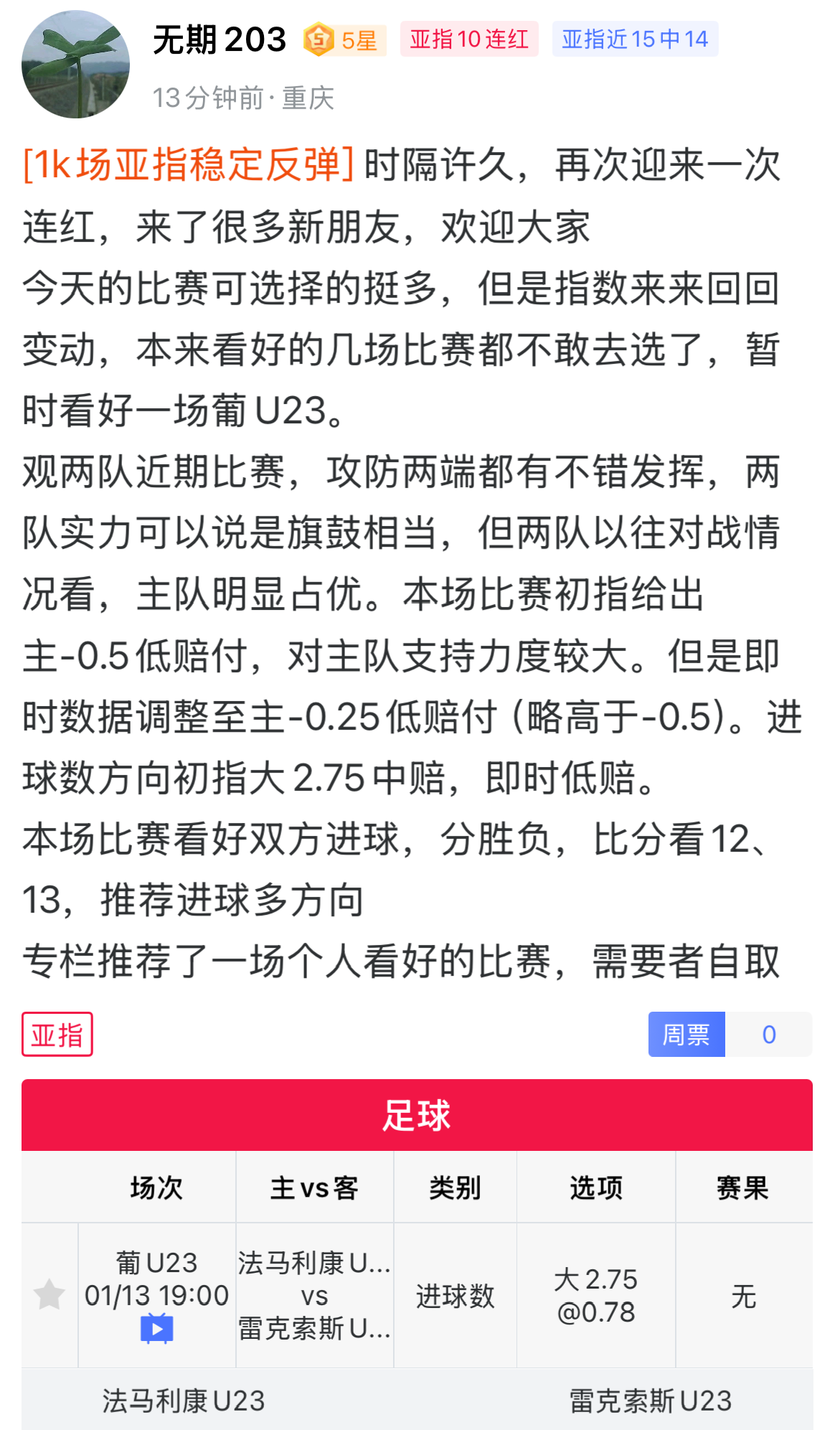 用户无期203 近期状态火热,亚指10连红,近15中14,今晚推荐葡萄牙U23联赛,可供参考。