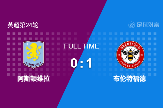 最终全场比赛结束,阿斯顿维拉主场0-1不敌十人布伦特福德。