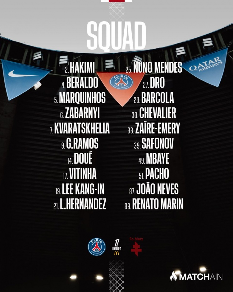 巴黎公布vs梅斯大名单:登贝莱、法比安·鲁伊斯因伤缺阵