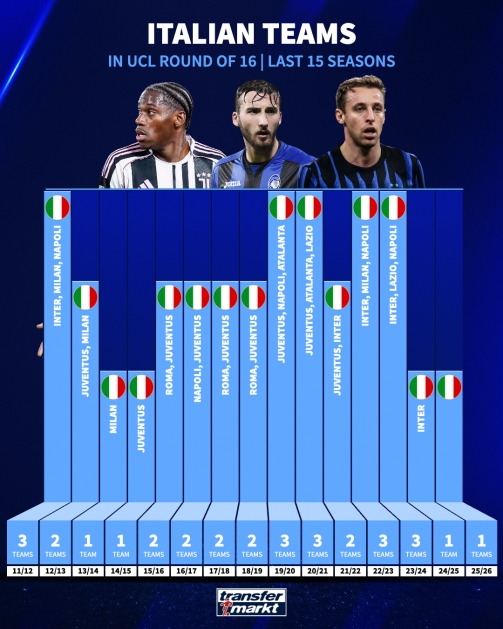 相关数据统计,本赛季欧冠16强仅剩亚特兰大一支意甲球队,上赛季16强同样只有国米一直独苗,在近15赛季欧冠赛事中,相同情况仅有过4次。