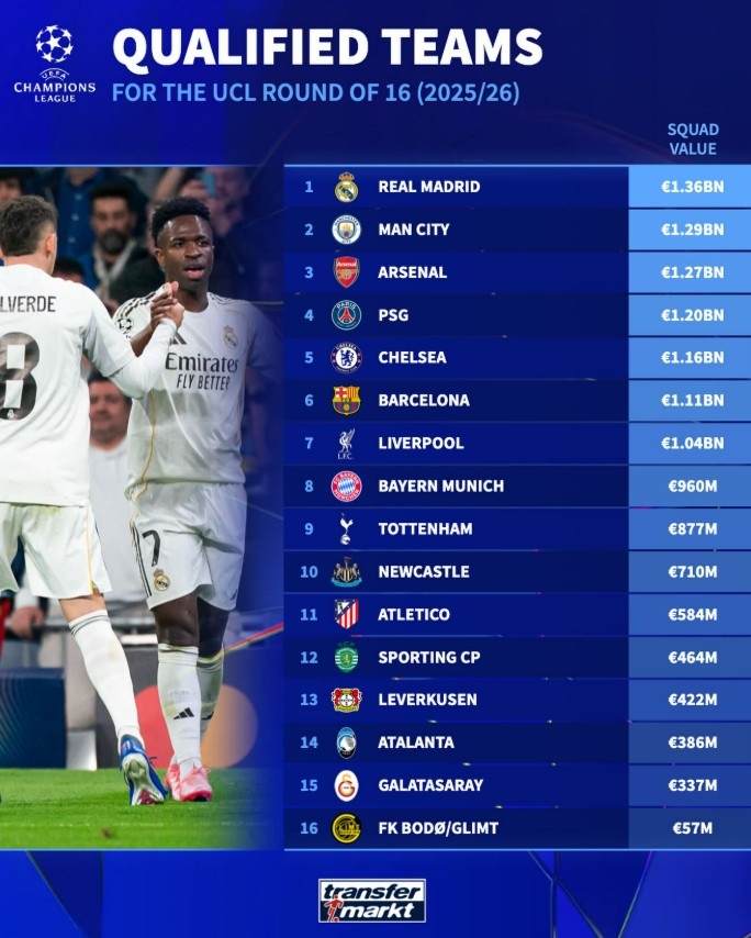 本周中,德国转会市场更新出了本赛季欧冠16强各支球队身价排名,其中皇马、曼城、阿森纳占据前三,卫冕冠军巴黎排名第四,身价最低的是博德闪耀仅5700万欧。