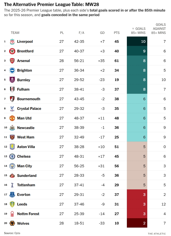 据《The Athletic》统计,本赛季英超联赛85分钟及以后进球与失球帮忙,利物浦打入10球最多,而利兹联被打入12球。