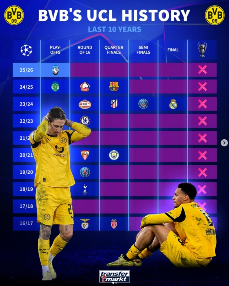 大起大落!多特近10个赛季欧冠:1次决赛,2次小组未出线