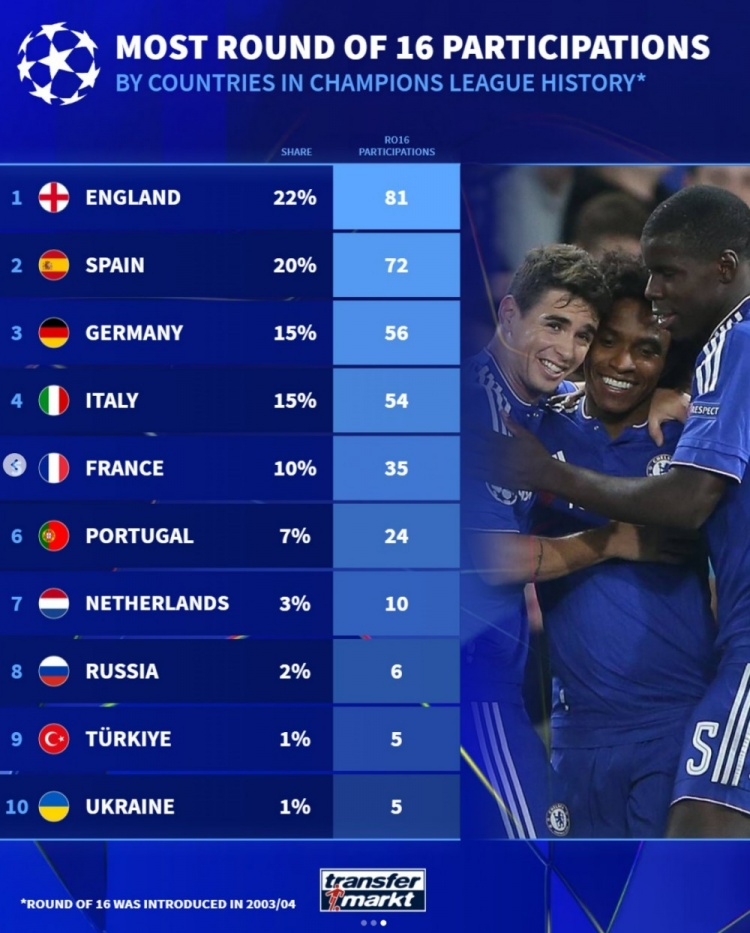 近22个赛季欧冠16强联赛占比:英超居首,西德意法前五