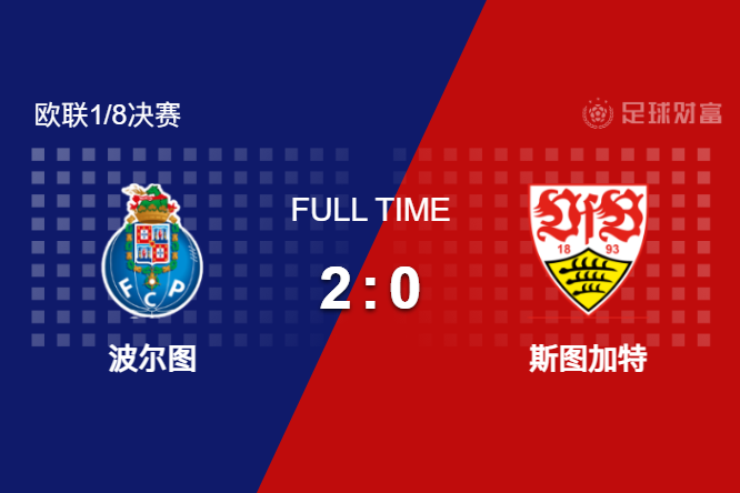 最终全场比赛结束,波尔图主场2-0轻取十人斯图加特,总比分4-1晋级。