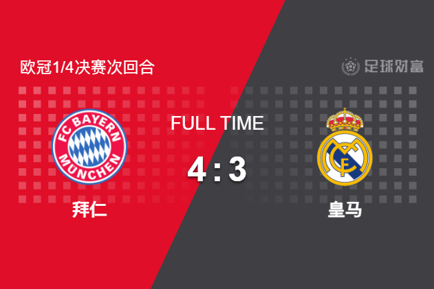 最终全场比赛结束,拜仁主场4-3逆转皇马,总比分6-4晋级半决赛(vs巴黎)。