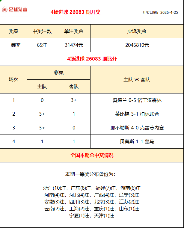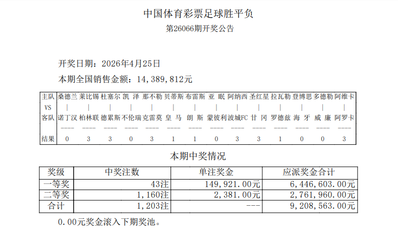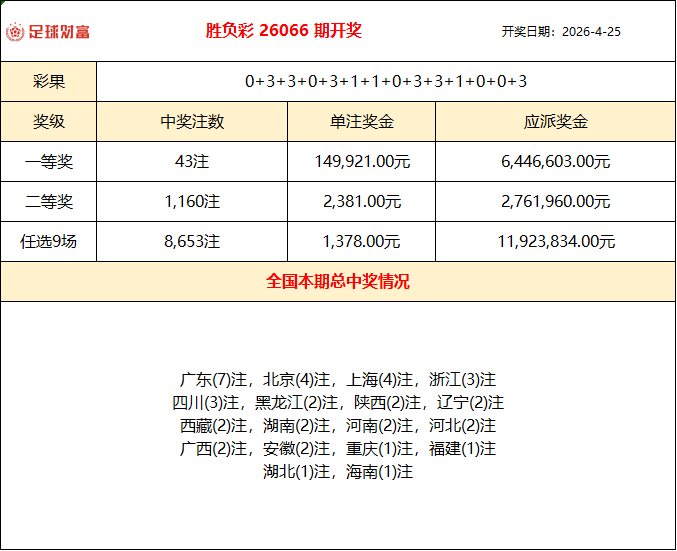 胜负彩26066期开奖:皇马遭读秒绝平!头奖43注14.9万