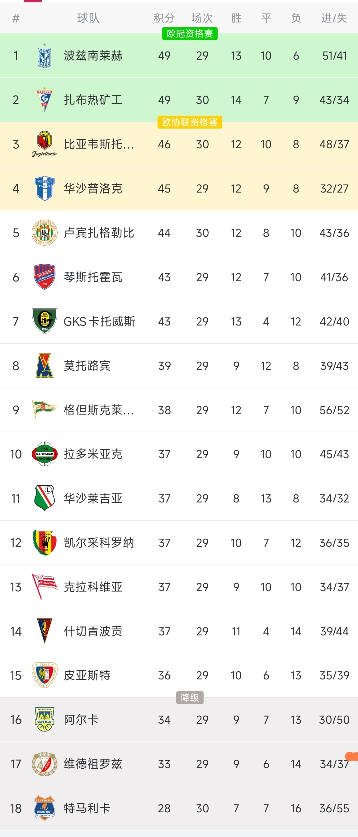 在2025/26赛季波兰甲级联赛中,本周末第30轮陆续打响,扎布热矿工、特马利卡分别在客场战胜各自对手,目前扎布热矿工多赛一场与榜首波兹南莱赫积分相同。