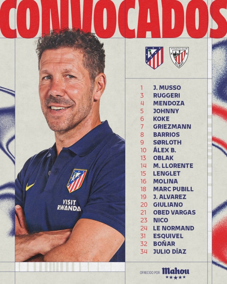 北京时间4月26日凌晨3点,马竞将会在西甲联赛第32轮主场对阵毕尔巴鄂竞技,赛前马竞公布本场比赛大名单,阿尔瓦雷斯、索尔洛特、科克领衔,奥布拉克、朗格莱入选。