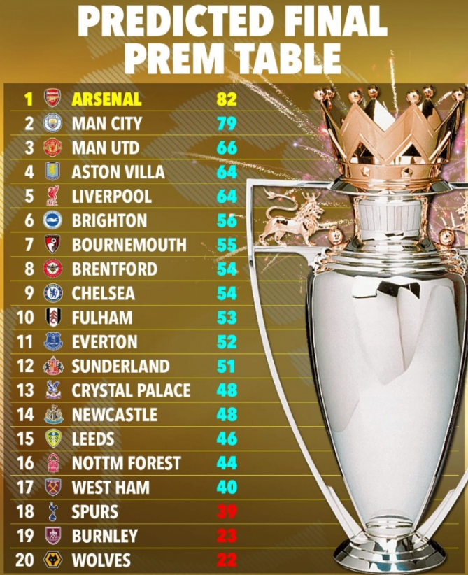 超算预测英超结局:阿森纳3分优势夺冠,热刺倒三降级